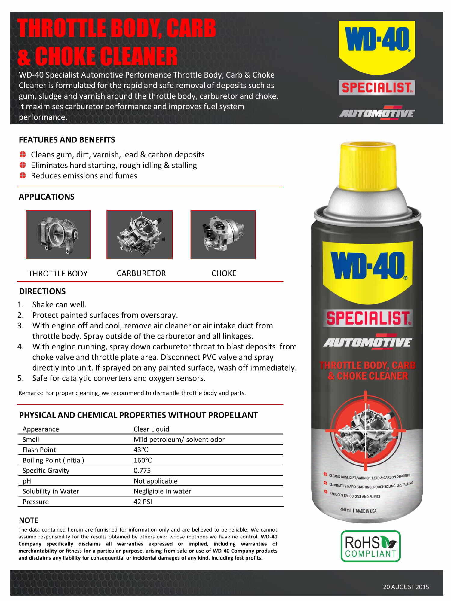 FORMULATED FOR THE RAPID AND SAFE REMOVAL OF DEPOSITS SUCH AS GUM, SLUDGE AND VARNISH AROUND THE THROTTLE BODY, CARBURETOR AND CHOKE