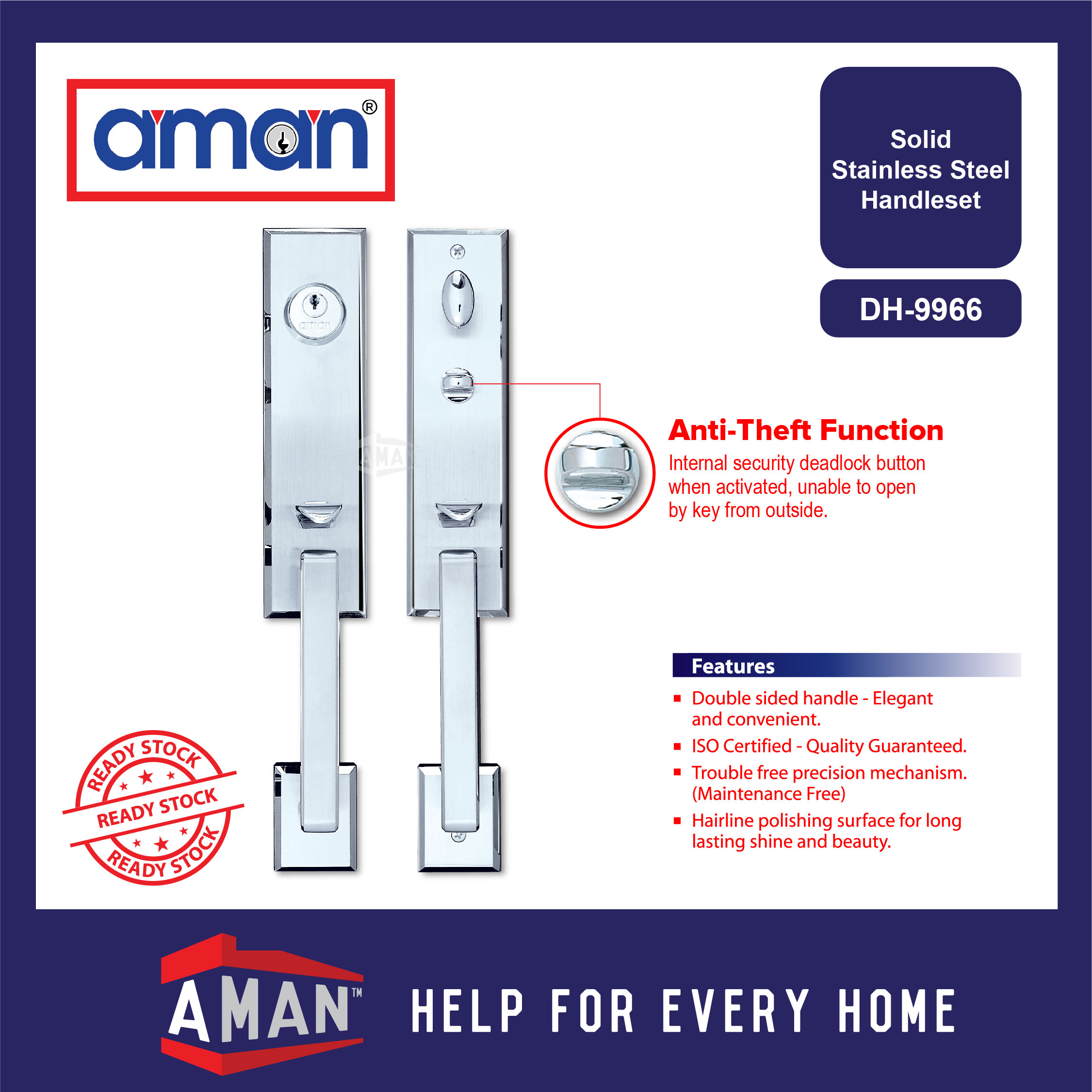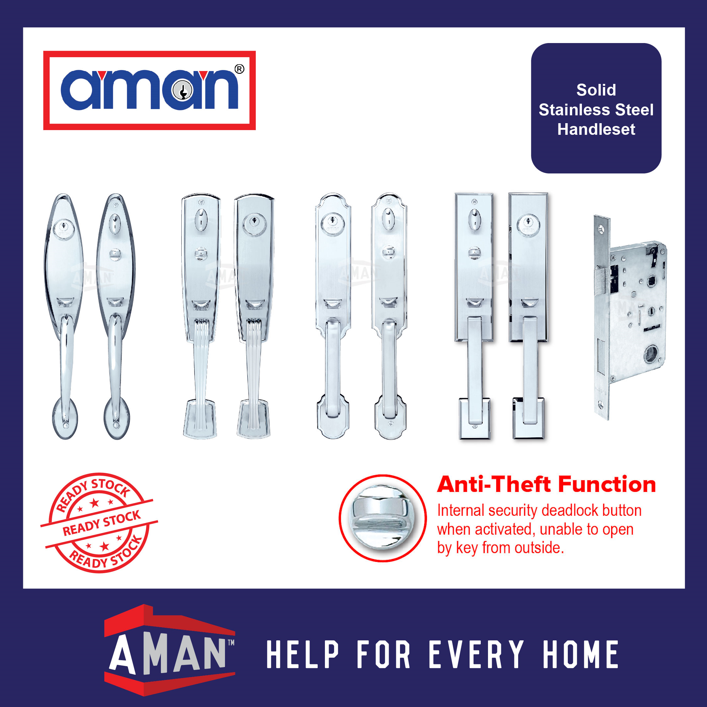 AMAN Solid Stainless Steel Double Entrance Handleset With Mortise Lockcase